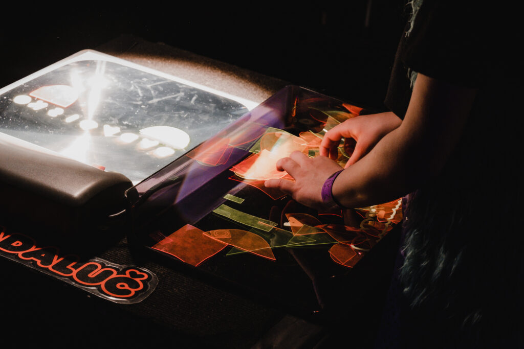 DadaLuč je interaktivna postojanka, kjer otroci in starši raziskujejo svet barvne svetlobe, senc in projekcij.