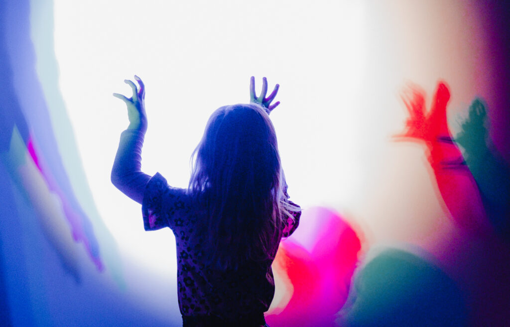 V enem kotu raziskujejo svojo silhueto v barvni različici – opazujejo, kako svetloba spreminja obliko, barvo in občutek telesa v prostoru ter ustvarjajo igrive vizualne sence.