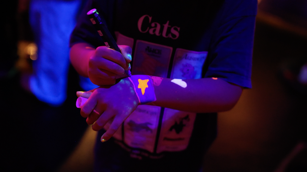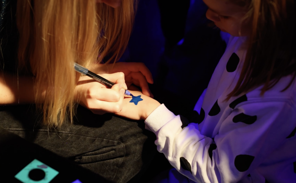 Poslikave izvajamo s šablonami (stencil tehniko), kjer udeleženci izbirajo med Dada liki in simboli. Šablone so naša DIY zasnova in natisnjene s 3D printerjem. Z njihovo pomočjo nastajajo igrivi neonski motivi, dopolnjeni z bleščicami.